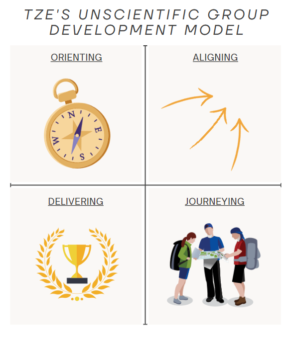 I’d like to propose an alternative model, one that I call Tze’s Unscientific Group-Development Model (TUG-D).