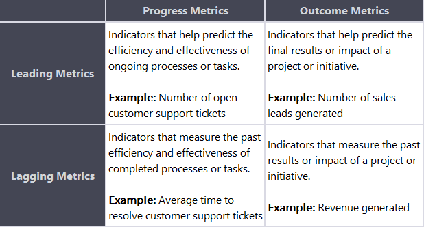 Understanding the differences between leading vs. lagging and progress vs. outcome metrics is crucial for making informed decisions and driving continuous improvement in any organization.